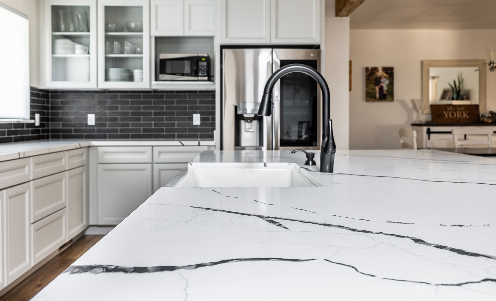 Calacatta marble-inspired quartz, featuring a bright white background with bold, dynamic black and light grey veining