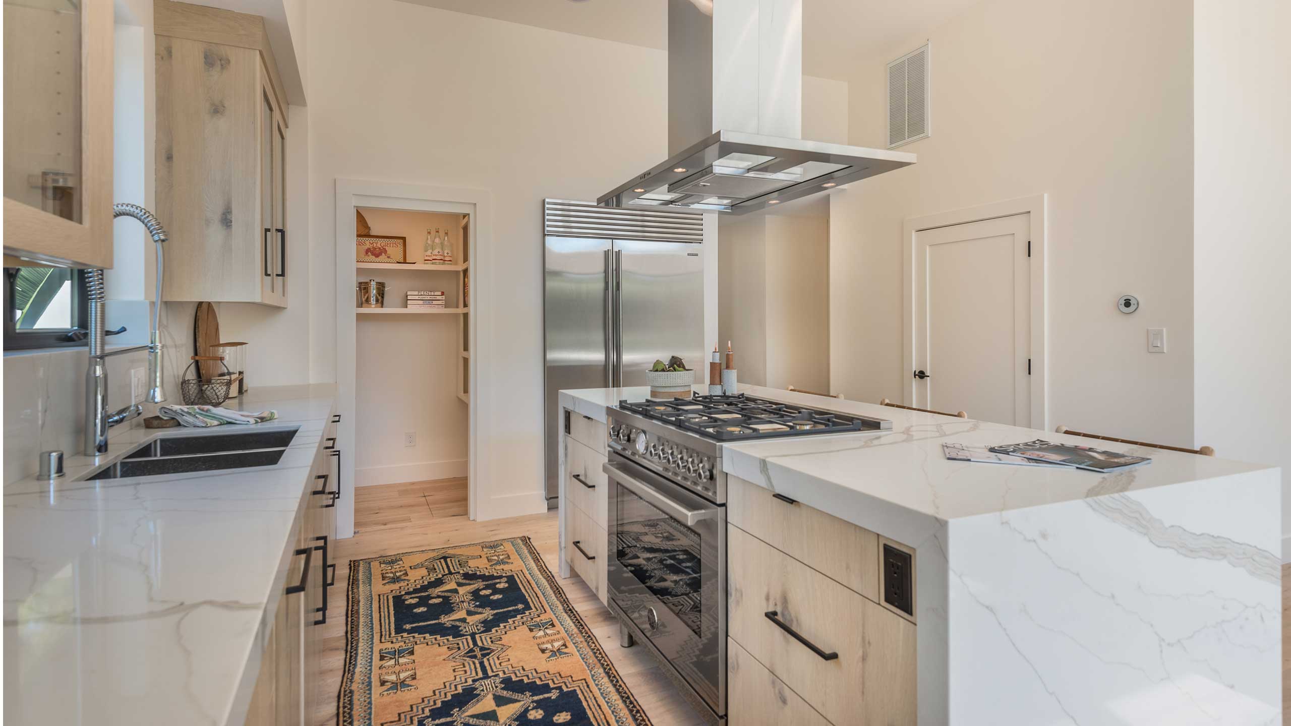 For traditional spaces, the quartz can be complemented with brass hardware, apron-front sinks and wood accents. Open shelving and wood island tops can add warmth against the Calacatta quartz counters.